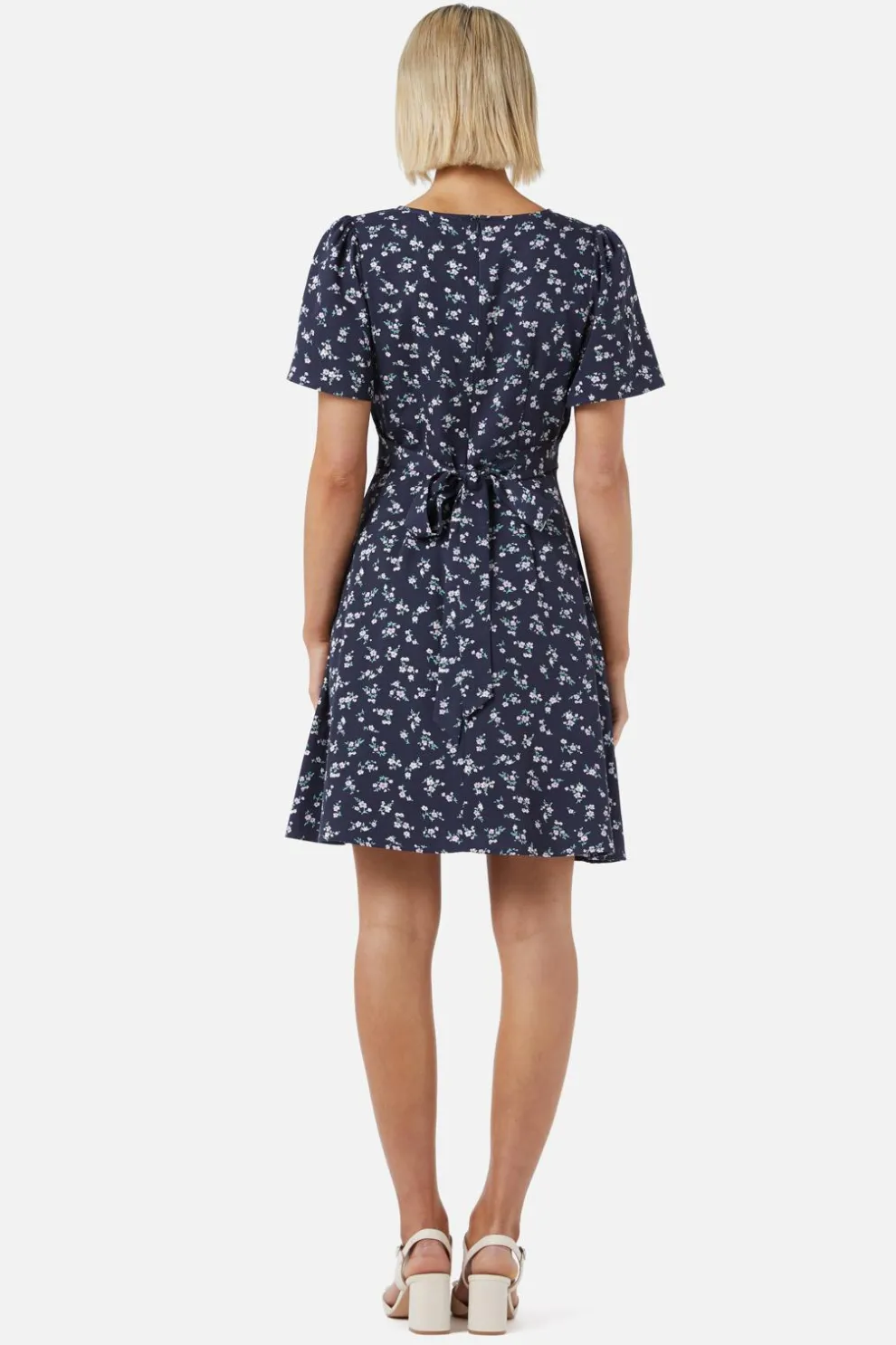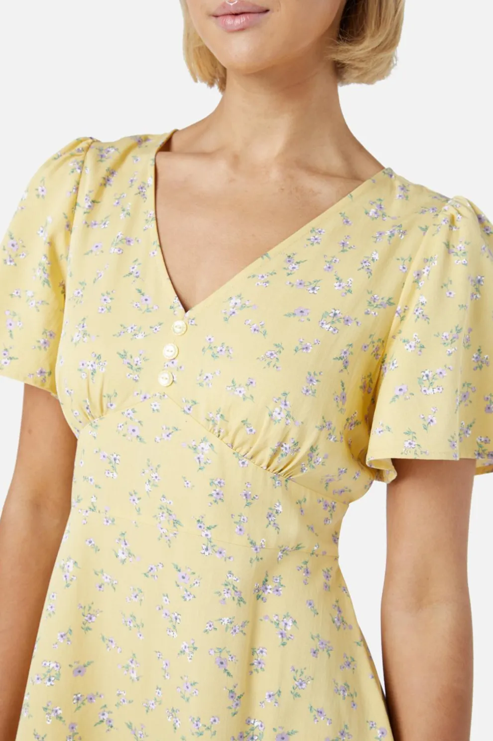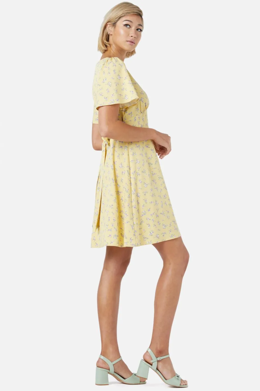 Featuring a flattering v-neckline and dreamy floaty sleeves, it’s perfect for twirling through picnics, coffee dates, or spontaneous adventures. A gentle yoke detail at the front adds charm, while thick side ties let you cinch your waist just right. The smooth skirt floats just above the knee – flirty, fun, and free-spirited.