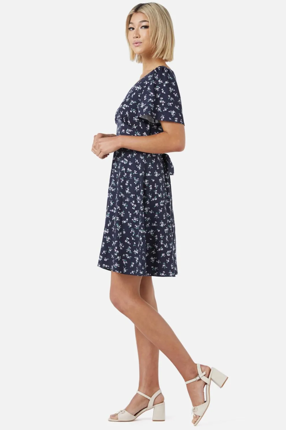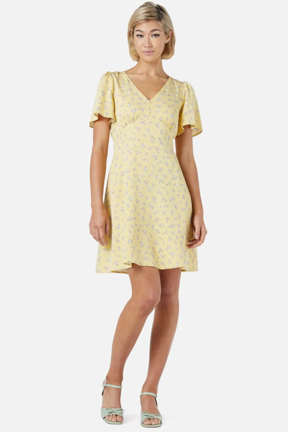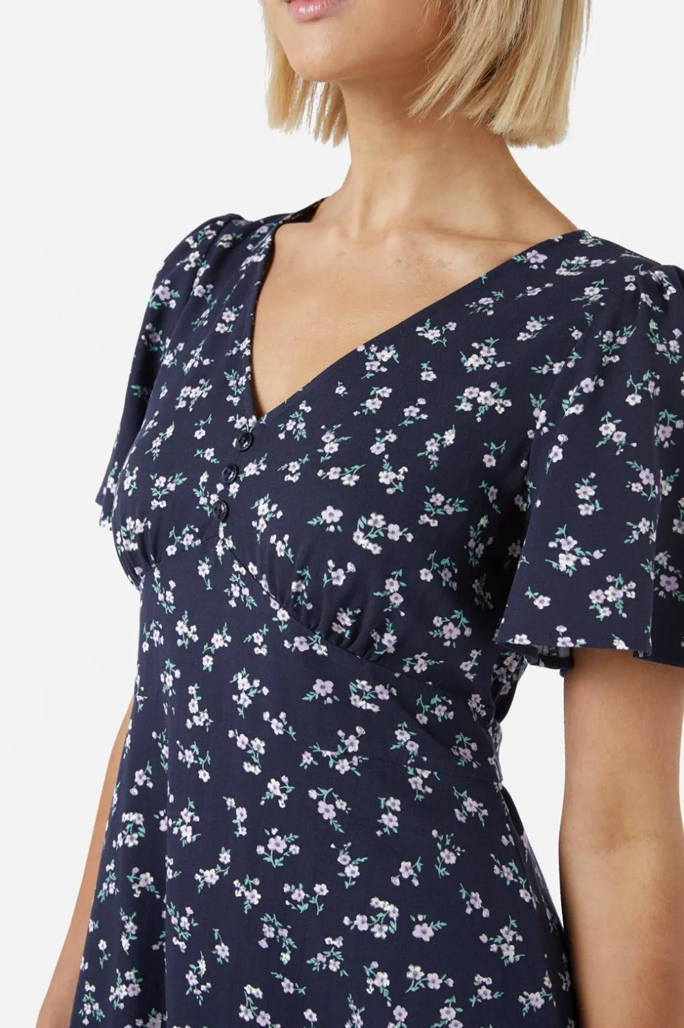 Featuring a flattering v-neckline and dreamy floaty sleeves, it’s perfect for twirling through picnics, coffee dates, or spontaneous adventures. A gentle yoke detail at the front adds charm, while thick side ties let you cinch your waist just right. The smooth skirt floats just above the knee – flirty, fun, and free-spirited.
