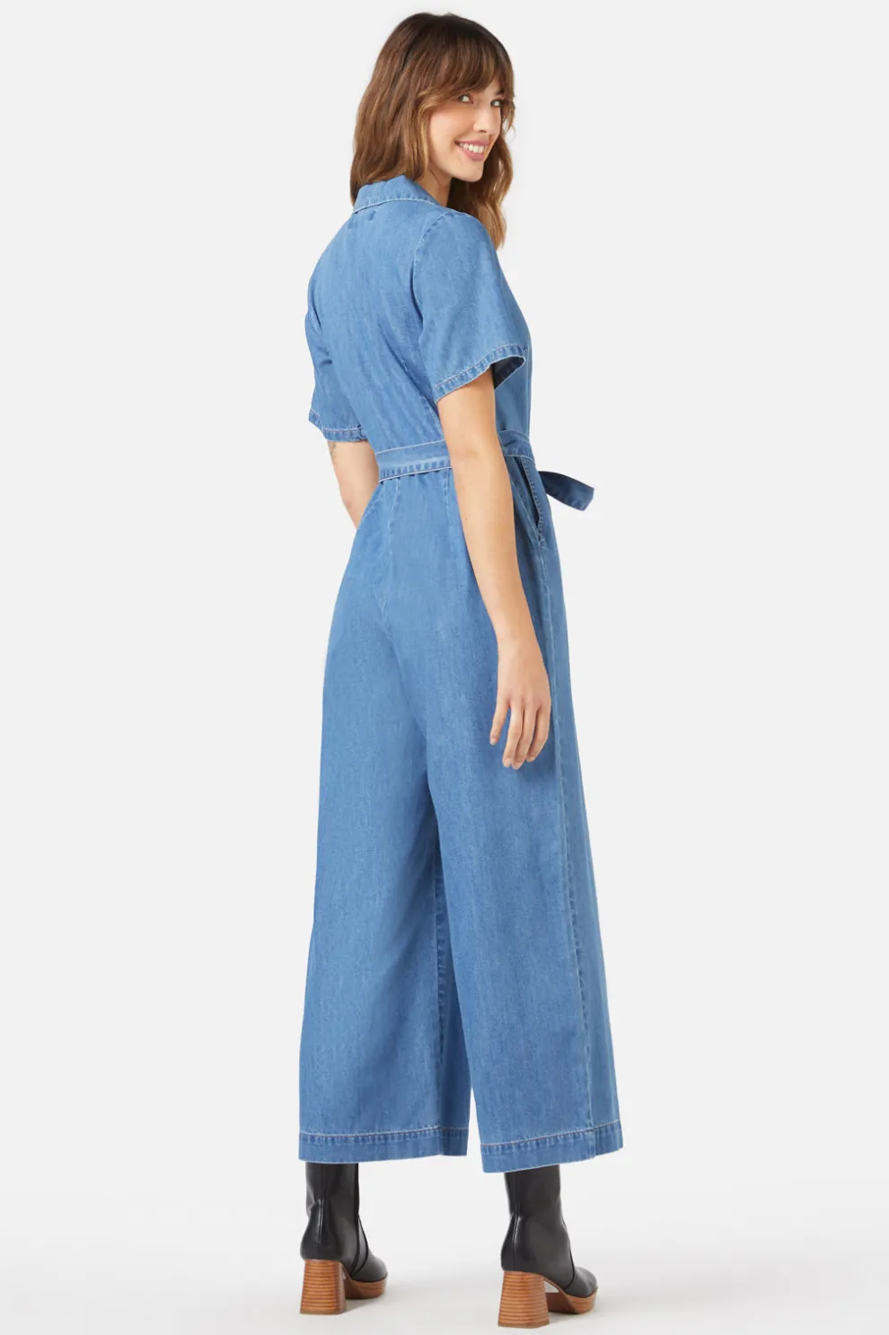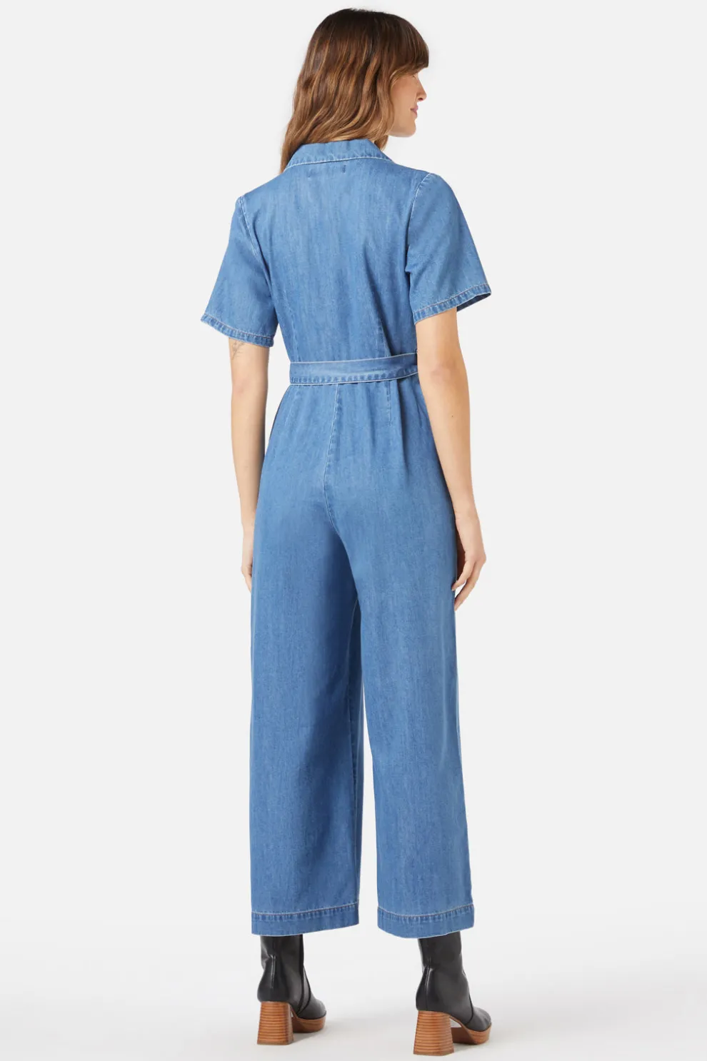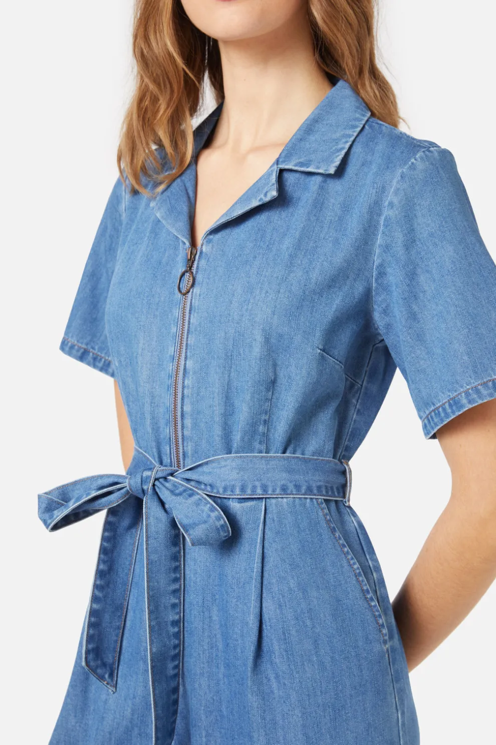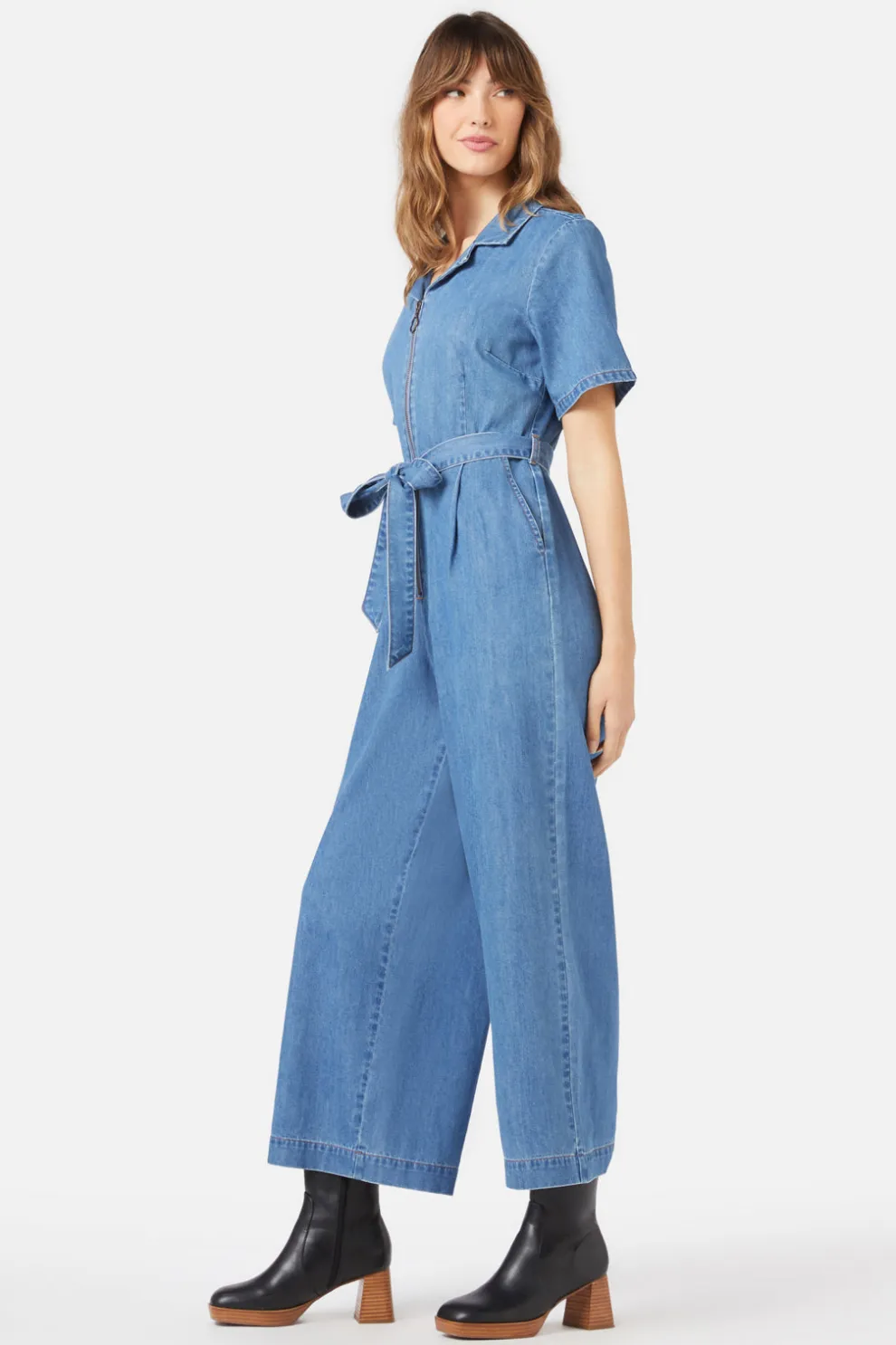 Effortlessly cool and vintage-inspired, the Olympia Jumpsuit by Princess Highway brings a modern twist to classic retro styling. Crafted from lightweight cotton denim, it features a flattering zip-front design, short sleeves, and a wide-leg cut for easy, everyday wear.