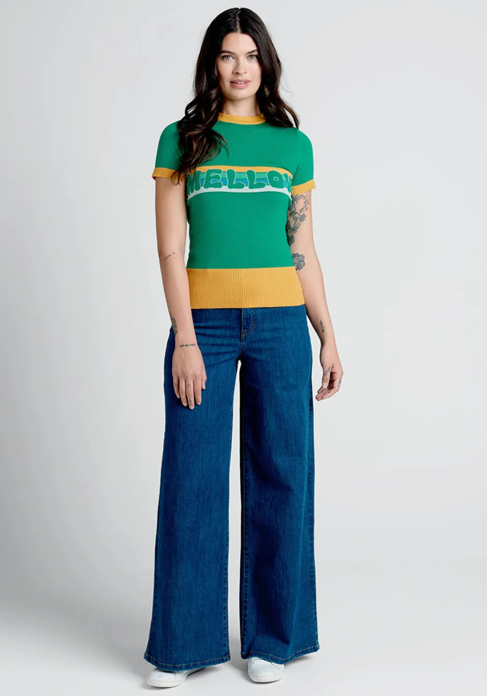 Say hello to this retro-inspired knit top from UK brand Bright and Beautiful! Made from a viscose-blend knit, this short sleeve green sweater boasts stripe detailing at the front in shades of yellow, blue, teal, and white beneath groovy green bubble letters that read, “Mellow.” So 70’s-inspired and truly unique, this causal knit tee boasts short sleeves and yellow ribbed-knit detailing at the crew neck, cuffs, and wide hemline.