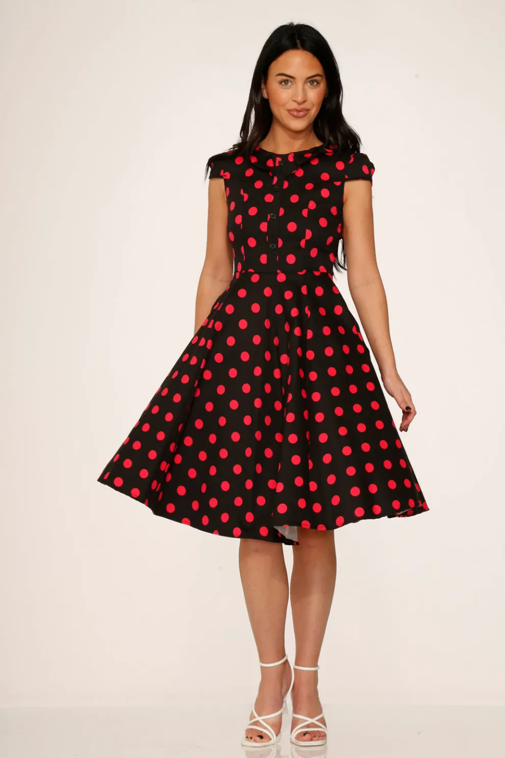 Sweet meets bold in the Black & Pink Polka Dot Swing Dress by Orchid Bloom. Featuring soft pink polka dots on a classic black backdrop, this vintage-inspired swing silhouette adds a touch of fun to any wardrobe.