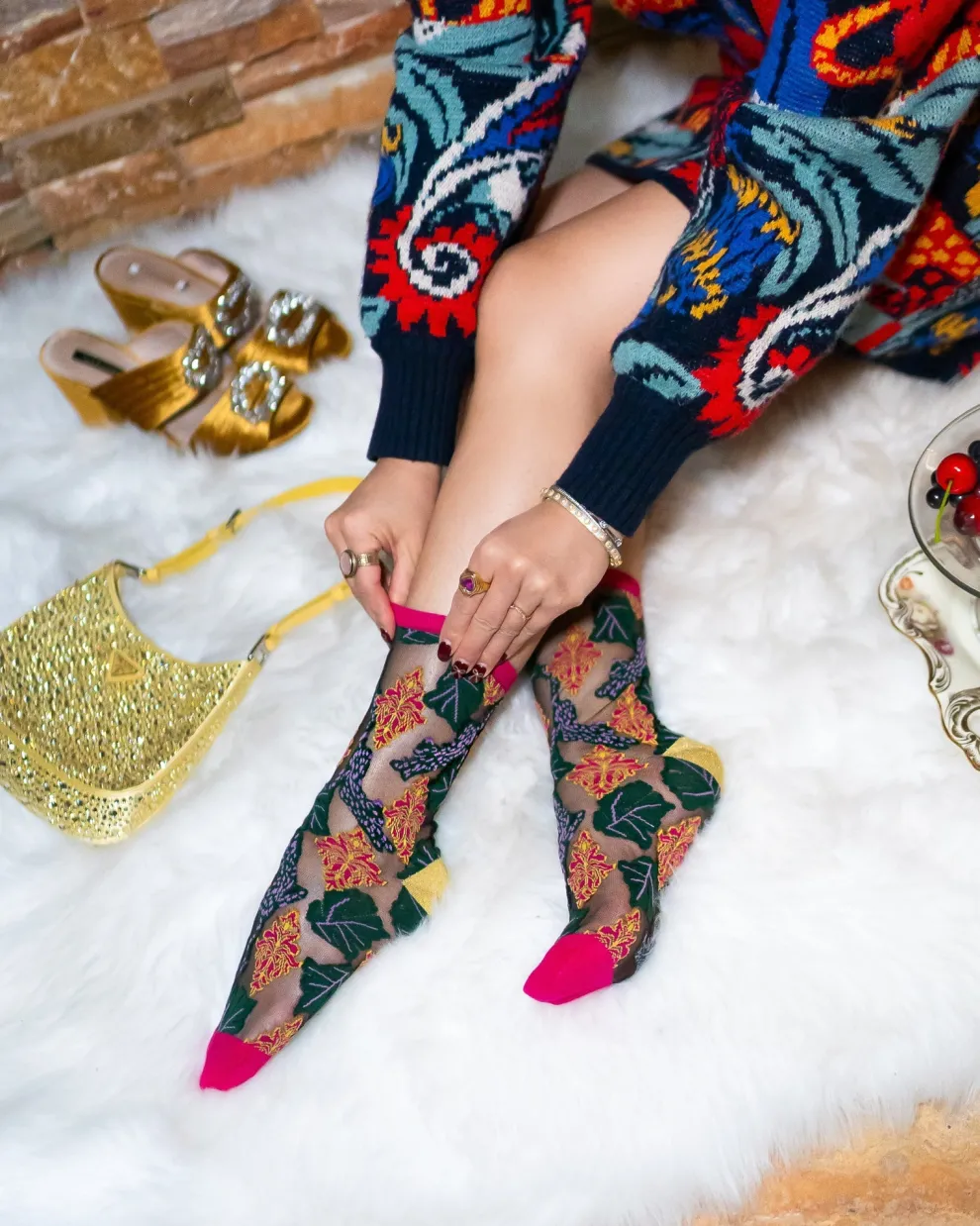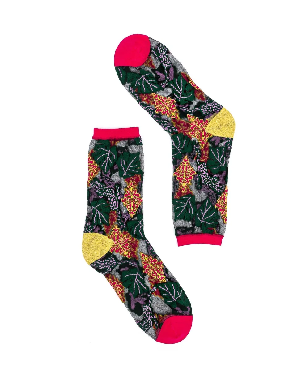 Feel like royalty in our decadent brocade jaguar print black sheer sock. An unexpected color combination of purple and green jaguars make this not your typical sock, while the gold shimmer heel gives your look a fancy touch. Finished against black sheer fabric for a sophisticated vibe.