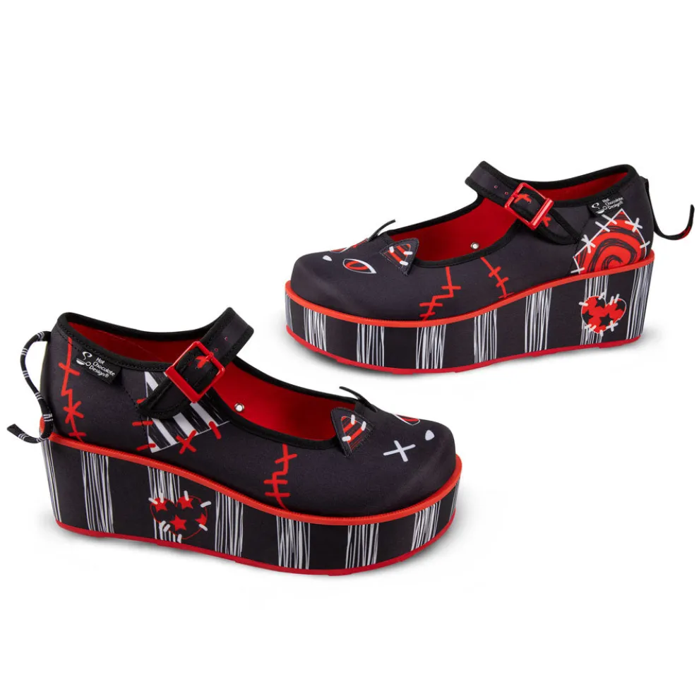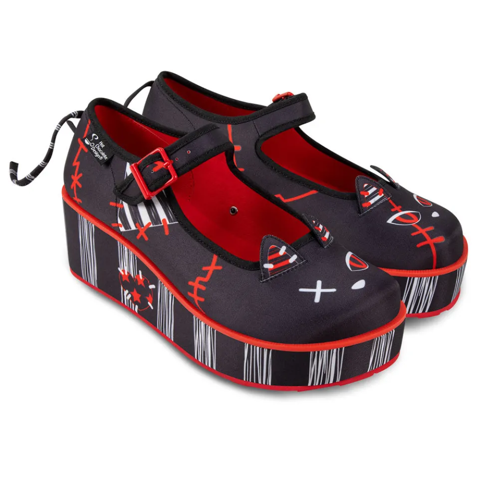 - Fabric upper and wedge with bold, stitched graphic print
