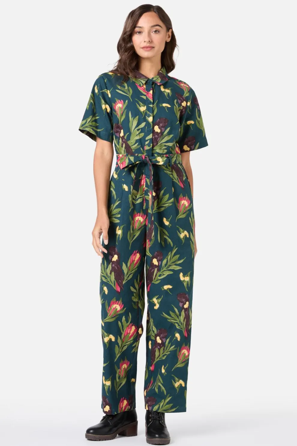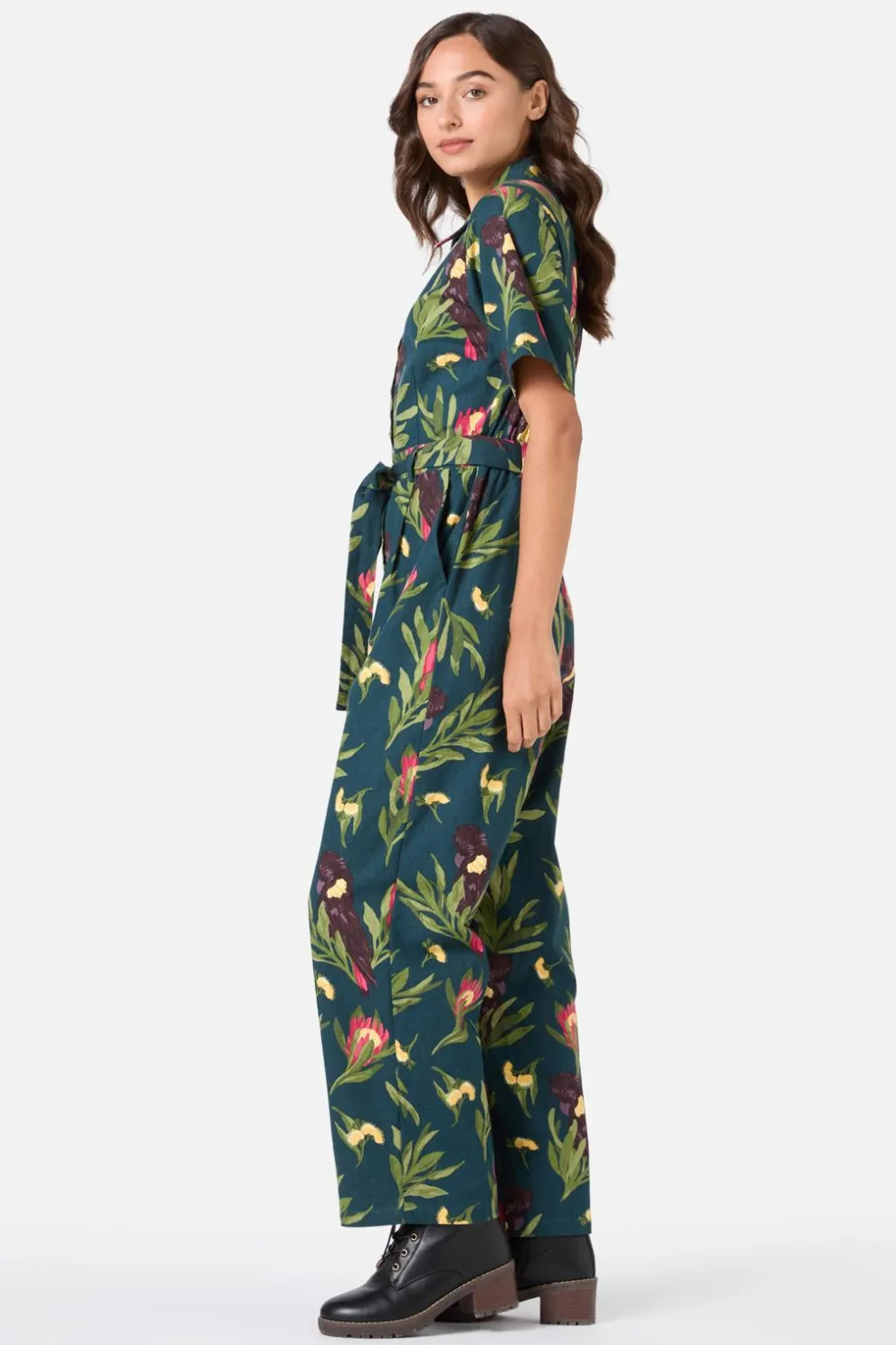 Take flight in vibrant style with the Cockatoo Jumpsuit by Princess Highway. Featuring a hand-painted print of red-tailed black cockatoos perched among bright native proteas, this collared jumpsuit is a true work of art.