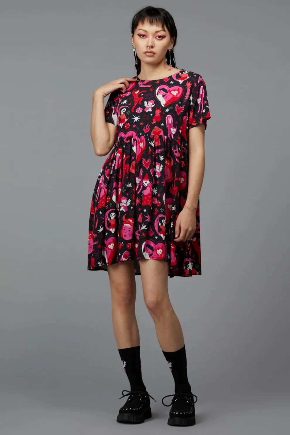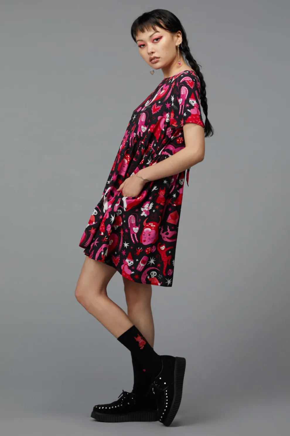 Embrace your inner diva with the Devil Dance Party Dress by Black Friday. This print dress features a round neckline and short sleeves, providing a classic silhouette that flatters all body types. The fitted style bodice accentuates the waist, while the flared skirt offers a fun and flirty vibe. The gathered waist adds volume to the skirt, enhancing the relaxed fit for ultimate comfort and style.