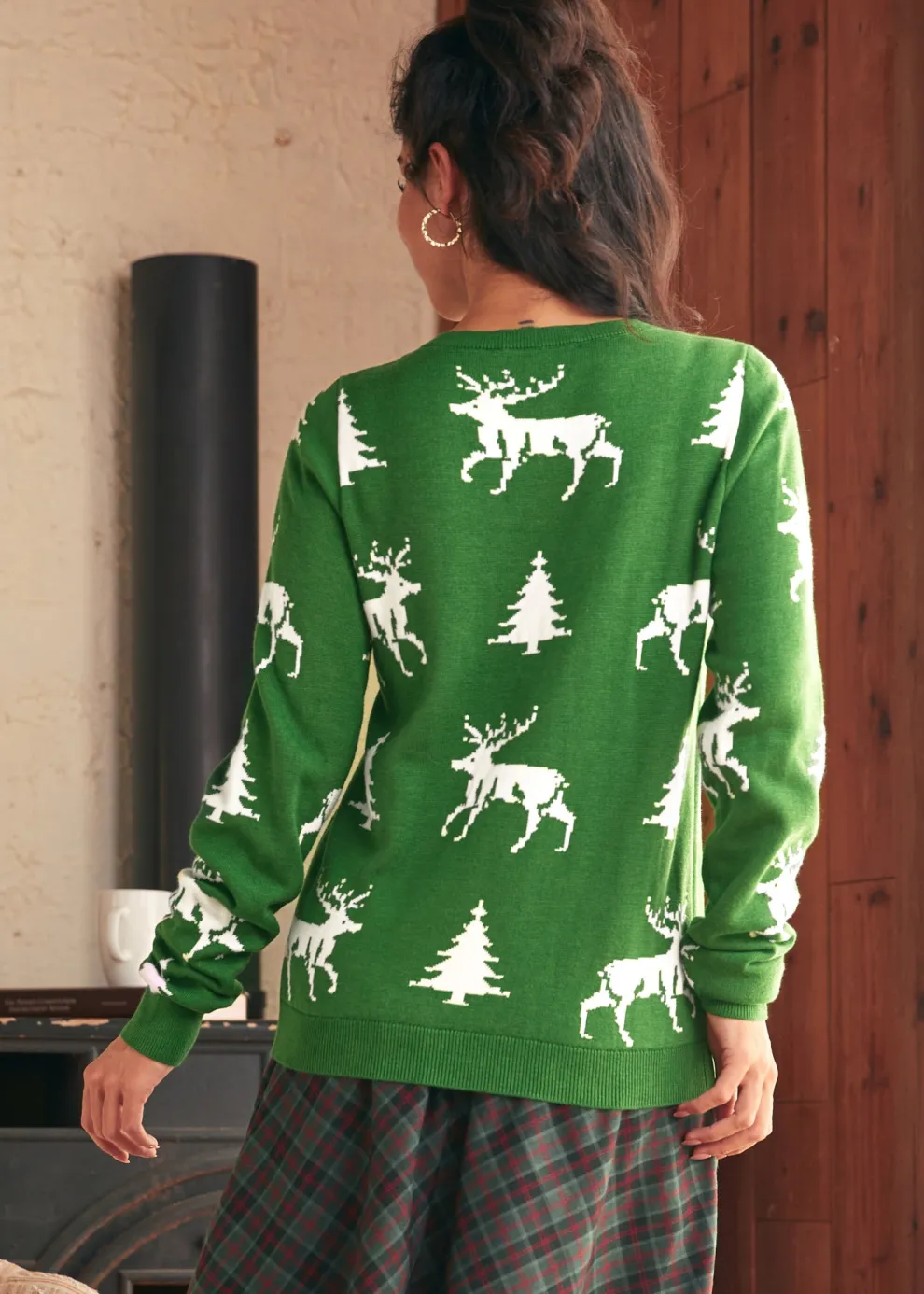 Step into a winter wonderland with the Enchanted Eve Boatneck Sweater in jade dream, a creation from our ModCloth namesake label. This green knit piece, with medium stretch, offers both warmth and whimsy, featuring a captivating reindeer and forest design. Its boatneck cut accentuates the collarbone, offering a flattering fit for festive occasions or simply when you want to bring a hint of enchantment to your day-to-day wardrobe.