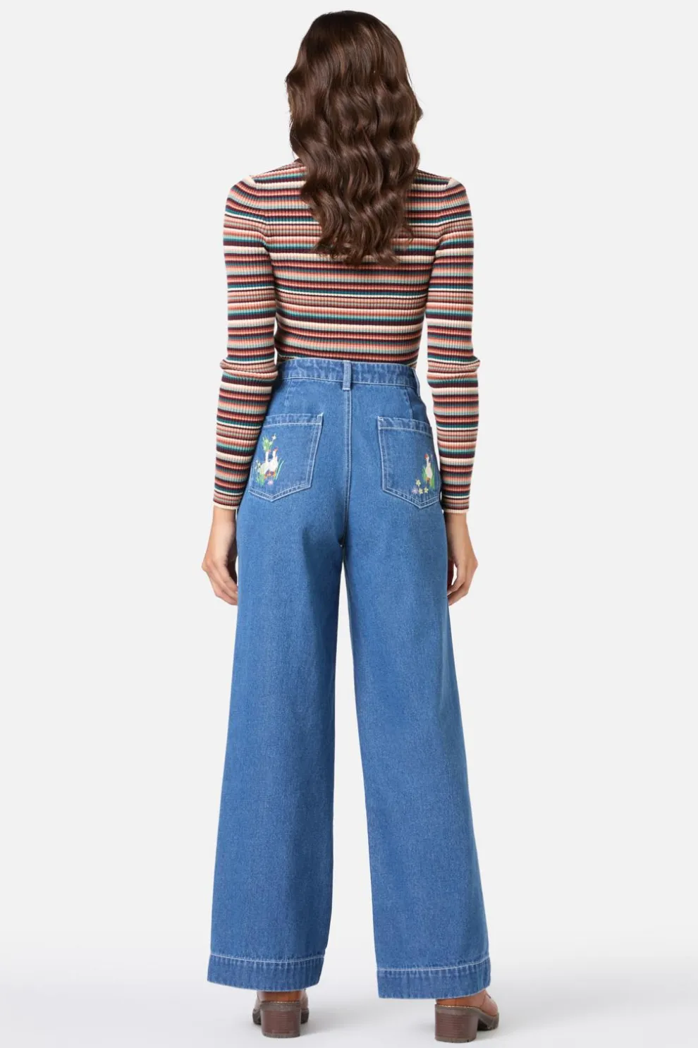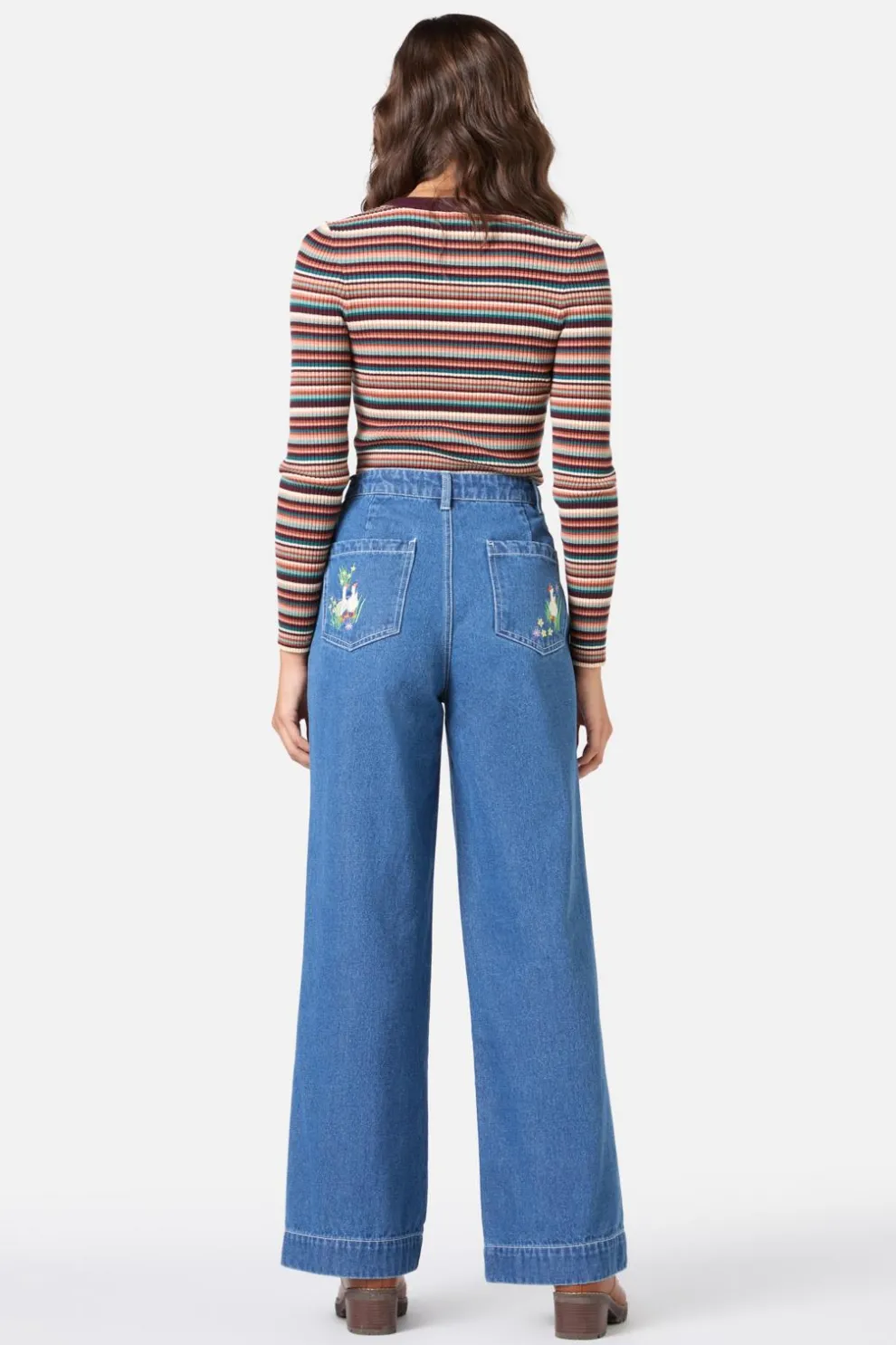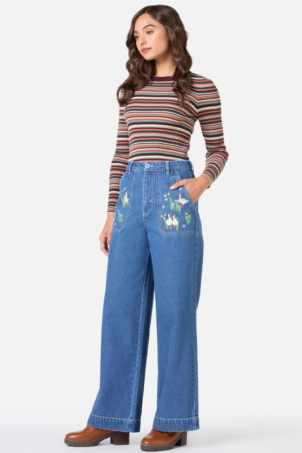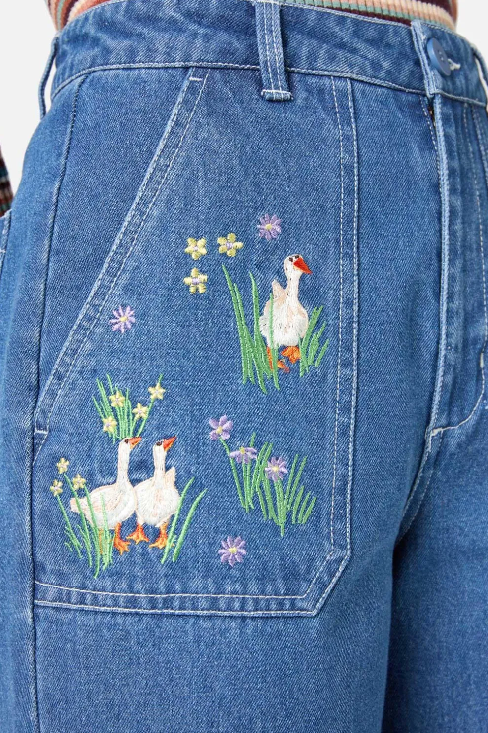 Waddle you wear when you want to stand out? The Goose Embroidered Denim Jean by Princess Highway is here to charm your closet. Crafted from rigid cotton denim, this playful high-rise pair features delightful embroidery of tiny geese and dainty flowers on the patch pockets. Equal parts quirky and classic, they bring a storybook twist to your everyday denim lineup. Style with a cardigan and clogs for full cottagecore flair.