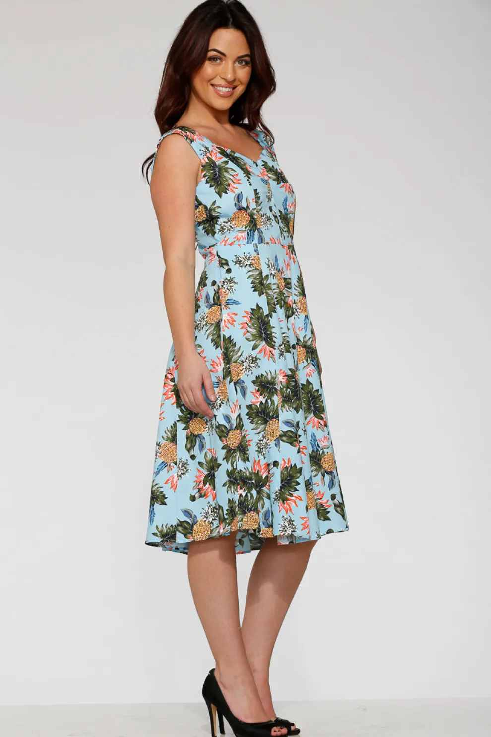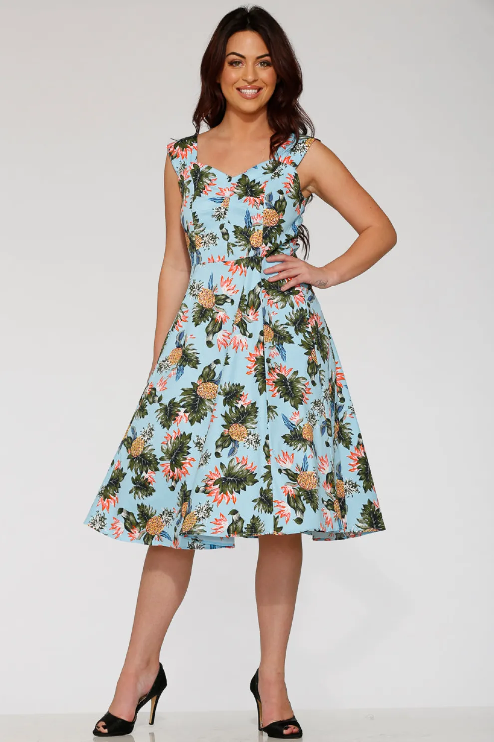 Tropical breeze, meet vintage ease! The Orchid Bloom Light Blue Hawaiian Swing Dress is a sun-kissed stunner featuring a lush pineapple and floral print on a dreamy sky-blue backdrop. With a sweetheart neckline, flattering bodice, and full swing skirt, this dress brings island energy to everyday adventures—or your next getaway.