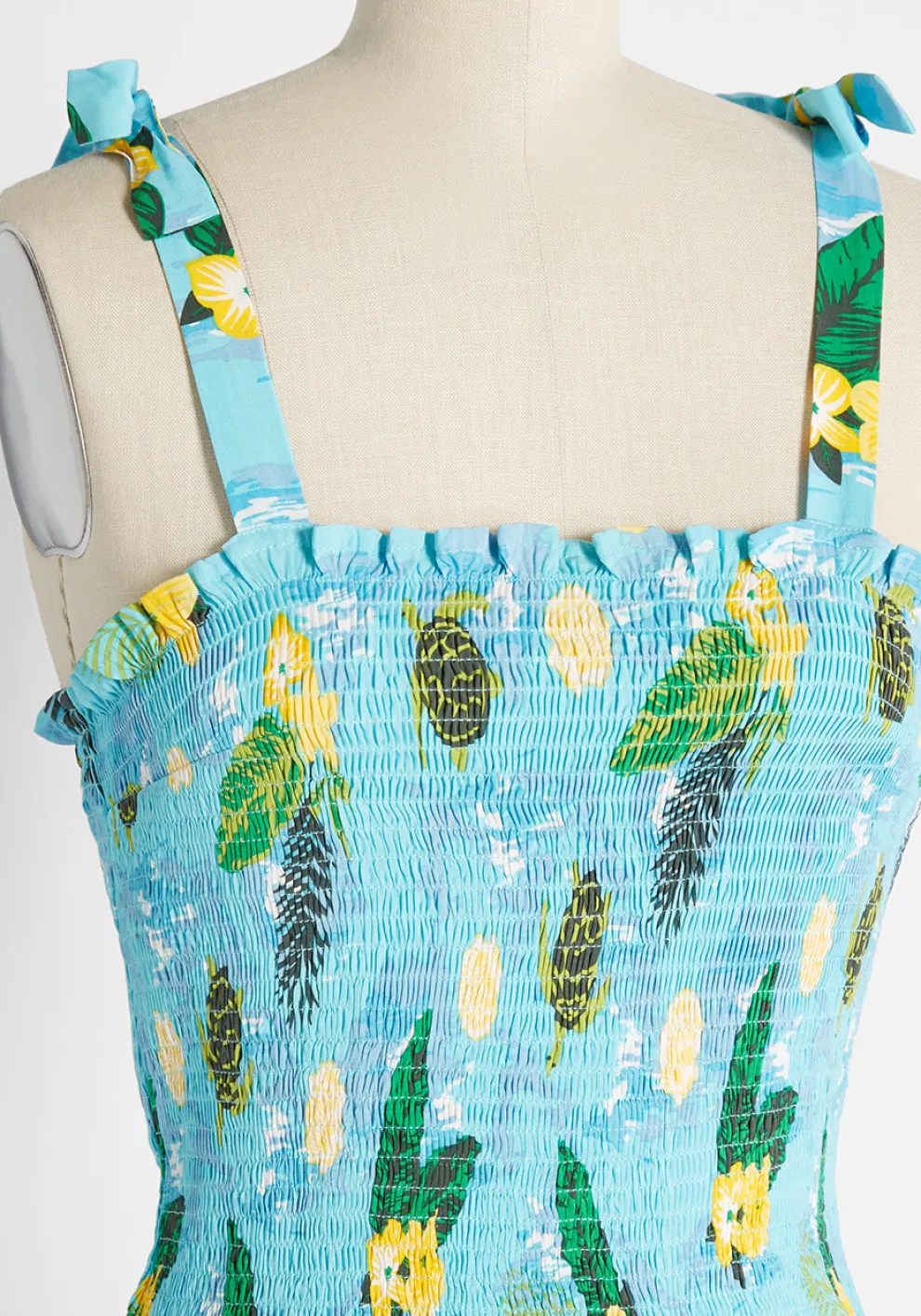 All aboard for a tropical soiree in this blue smocked tank top from our latest ModCloth x Collectif collab! Boasting an exclusive print of green sea turtles, ivory seashells, and bundles of lush green palm fronds accompanied by cheerful yellow blossoms over a seeming reflective background of swirling shades blue that imitate the crystalline water’s surface, this darling is full of vintage-inspired charm. Featuring comfy smocking throughout, darling tie-shoulder tank straps, ruffle trim detailing at the edges, and a vintage-inspired cropped silhouette, this sleeveless top will make you feel like you’re on vacation from the moment you put it on.