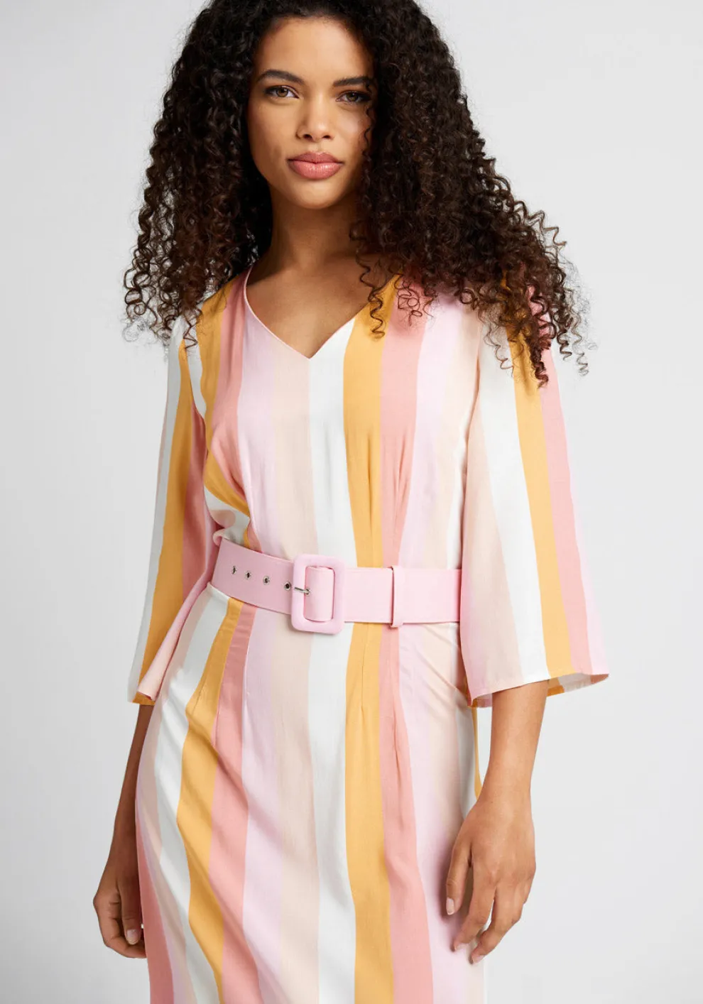 All the sweetness of summer is simply radiating from the creamy sorbet-esque hues of this ModCloth x Collectif collab striped maxi dress! Made from a lightweight woven fabric with a vintage-inspired vertical stripe design in delicious shades of pink, white, and yellow, this beautiful floor-length dress boasts a V-neckline, elbow-length sleeves with delicate asymmetrical detailing at the cuff, and a retro-fab waistline that is sweetly cinched by a pink-hued adjustable belt. Elegant enough for a fanciful day party, and playful enough for brunch with the girls this delightfully unique floor-length dress belongs in your life!