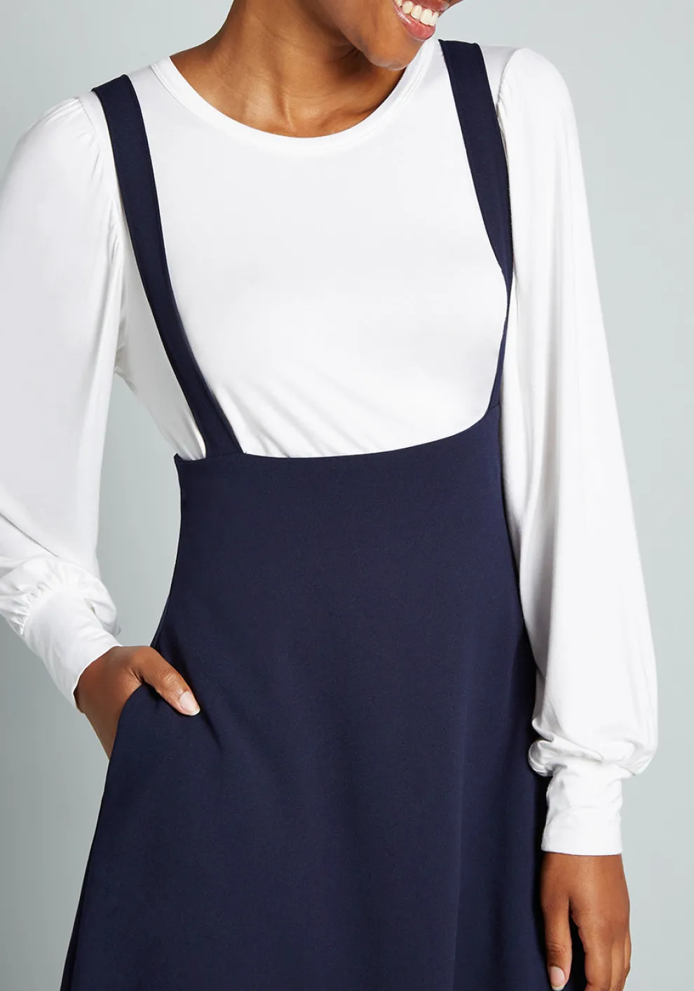 Pioneer a series of groundbreaking looks with this dark navy jumper from our ModCloth namesake label, and a wave of accolades will await you! Made from a stretchy woven fabric, your winning ensembles begin with the high-waisted silhouette and pockets of this supportive skirt, and boasts a customized finish from your favorite tees, blouses, and tops in any colors or patterns that make you feel at the top of your fashion game.