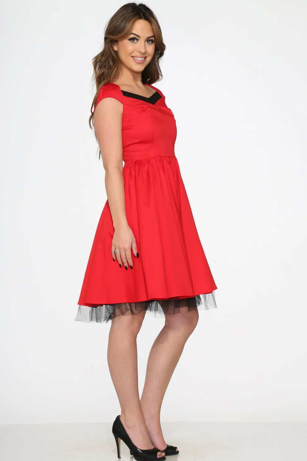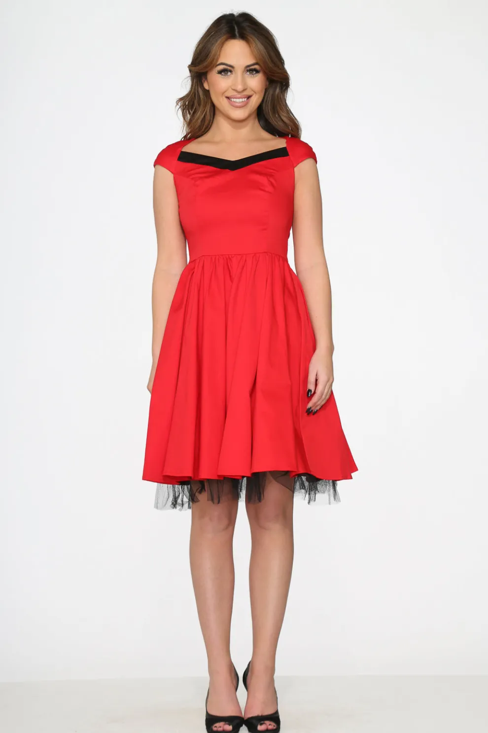Make a statement in this bold and flirty swing dress from Orchid Bloom. Crafted in vibrant red with a striking black neckline trim, this vintage-inspired silhouette features a full skirt perfect for twirling, with subtle stretch for comfort and movement. A side zipper ensures a smooth fit, while a peek of black tulle at the hem adds a playful finish.