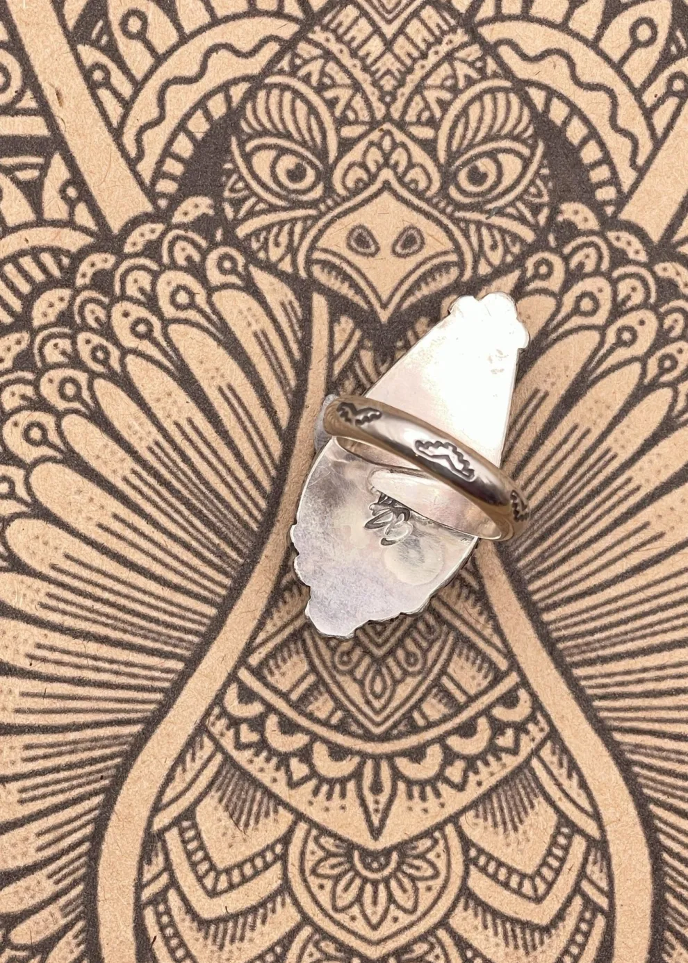 Handmade in California, this one-of-a-kind sterling silver ring features a vibrant turquoise gemstone, set in a sterling silver scalloped bezel and framed by twisted/beaded deco wire for an elegant, handcrafted touch. This unique design highlights the beauty and timeless appeal of turquoise, making it a meaningful and stylish statement piece.