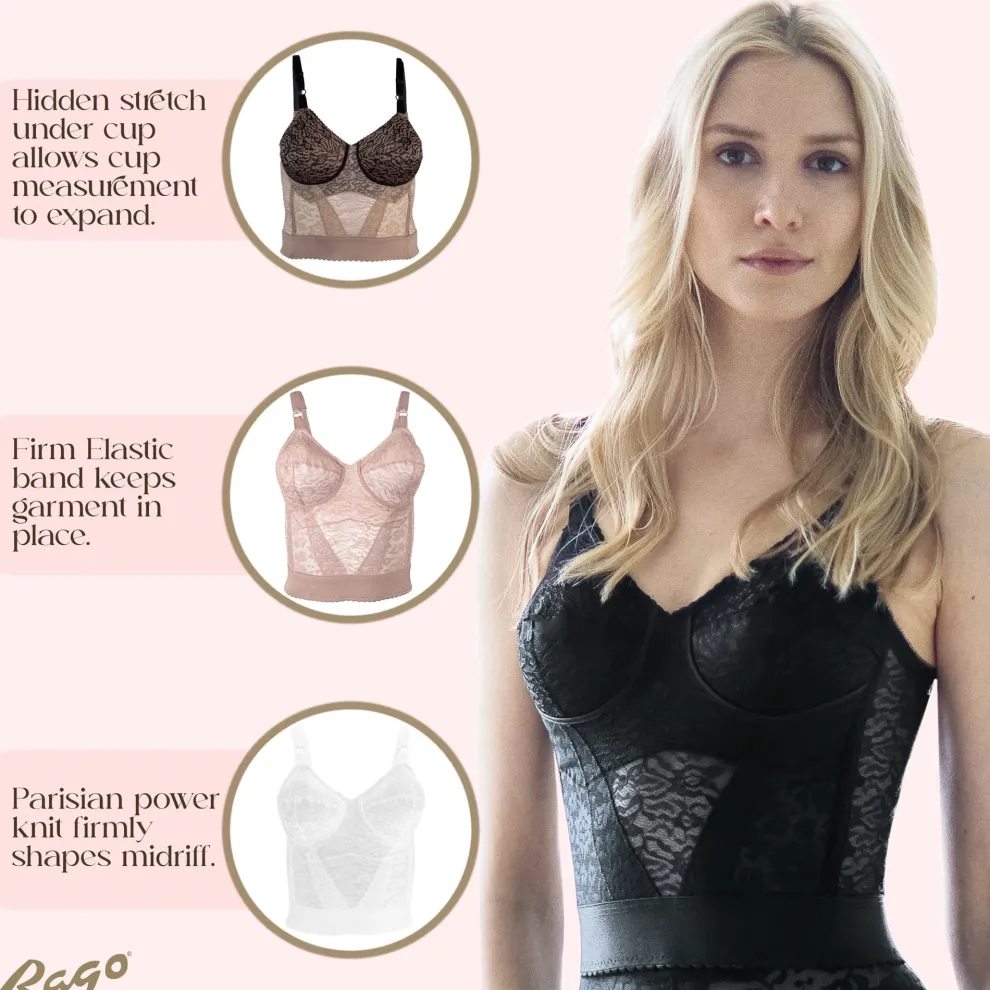 Lift without a wire! The Rago Lacette Longline Wireless Expandable Cup Bra 2202 is made of fabric that is sheer yet offers strong support. It has 3-part, fiber-filled, lined, wireless cups that support and shape the breasts. Rago’s Lacette Longline Wireless Expandable Cup Bra 2202 has horizontal cup seaming and powermesh knit at the bottom of the cups that stretches to fit your natural shape..