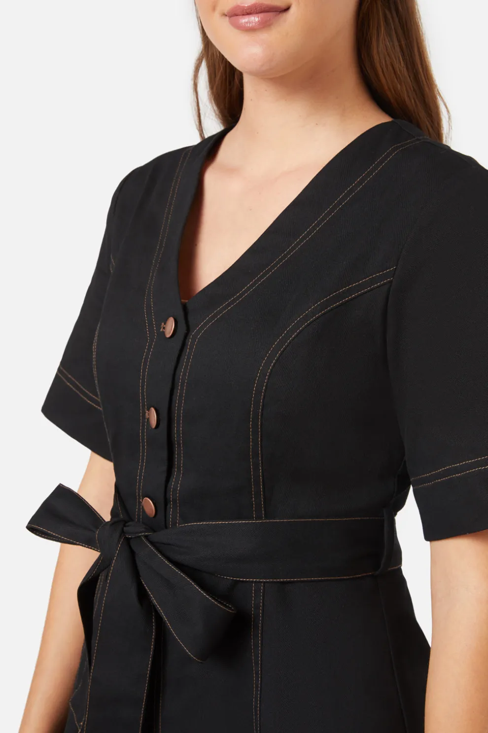 Tiana Mini Dress by Princess Highway: Embrace casual chic with the Tiana Mini Dress in black denim. This fit-and-flare style mini dress is crafted from durable cotton twill for everyday comfort. Featuring a V-neckline, button-through front, and flattering short sleeves, it’s designed with contrast tan stitching and a detachable waist tie to add a bit of retro flair. Perfect for a laid-back day or a night out, this dress combines ease and style seamlessly.