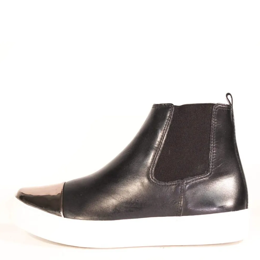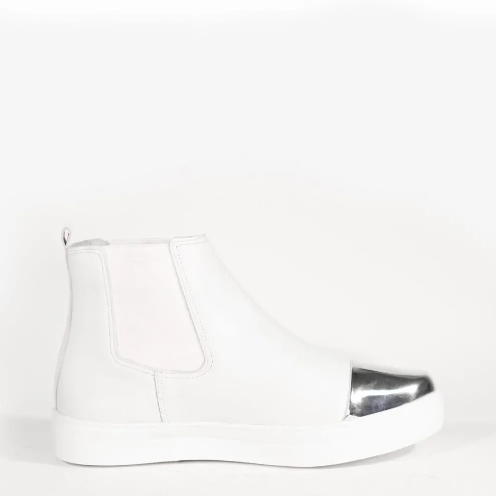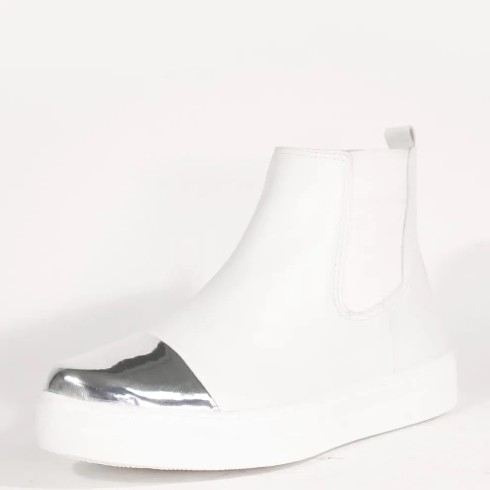 Elevate your sneaker game with the Walter High Top Sneakers by Chelsea Crew. Crafted from genuine leather with a standout silver toe cap, these slip-on kicks put a bold twist on a classic silhouette. The 1″ platform adds subtle height, making them a stylish go-to for everyday edge with a touch of shine.