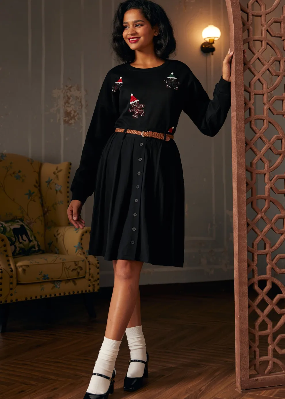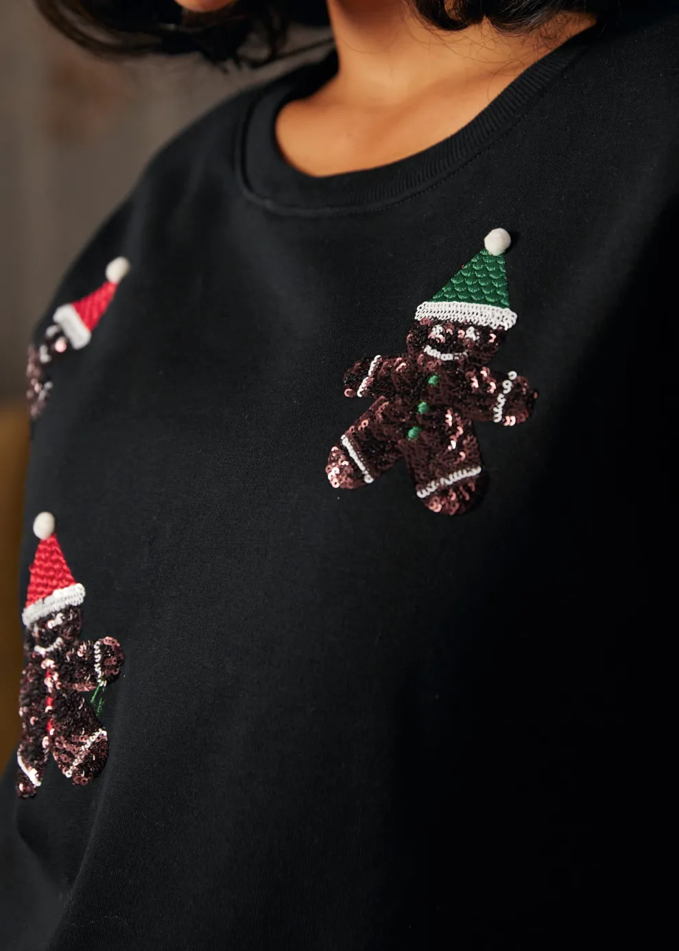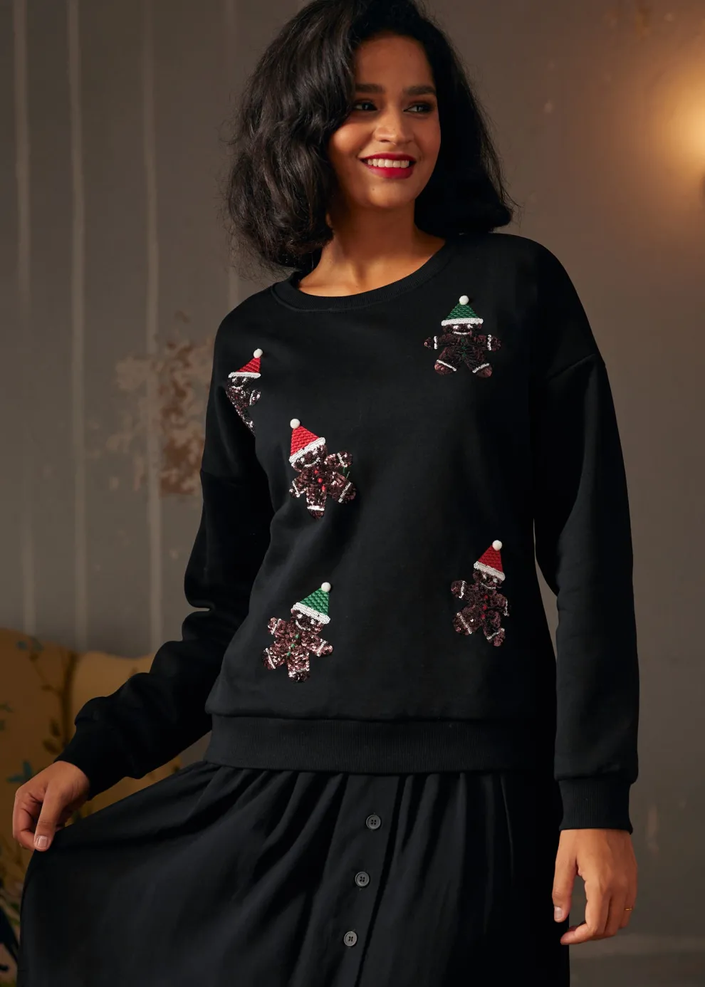 Indulge in the sweet comfort of the Whimsical Gingerbread Man Sweatshirt, lovingly crafted by our ModCloth namesake label. With a backdrop of dark spice, this knit sweatshirt features an adorable gingerbread man print that’s sure to bake up smiles. Ideal for casual gatherings or adding a touch of nostalgia to your winter attire, it’s a fashionable way to embrace the joy of the holiday season.