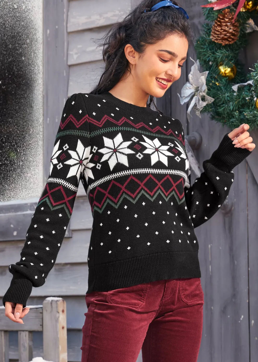 Experience the magic of winter with the Whimsical Winter Puff Shoulder Sweater in eclipse noir, a treasure from our ModCloth namesake label. Featuring delicate puff shoulders and balloon sleeves, this black knit sweater, complete with a button closure, offers a medium stretch for comfort. Its unique design pairs effortlessly with skirts and trousers alike, making it a go-to for holiday gatherings or when you wish to add a touch of elegance to everyday wear.
