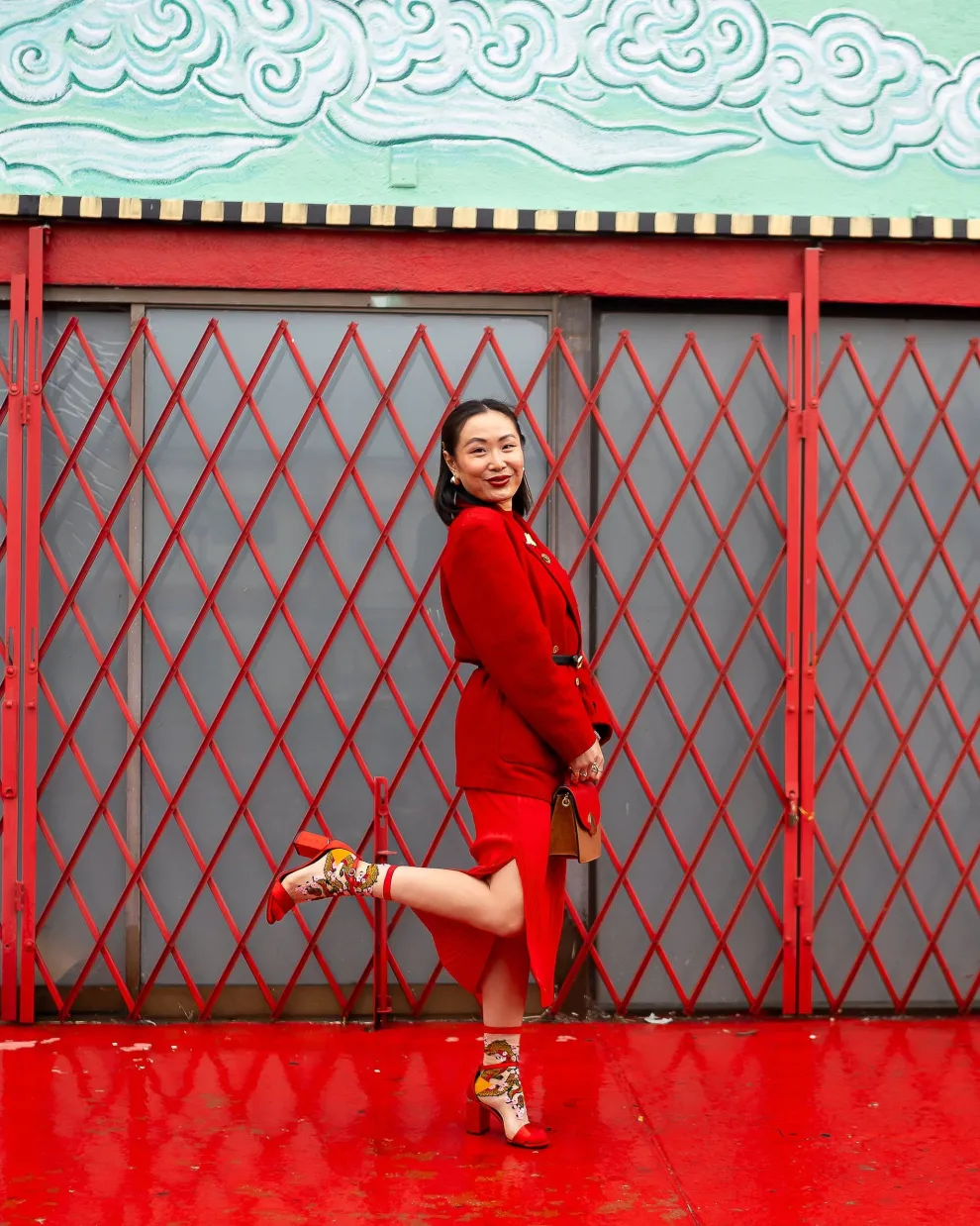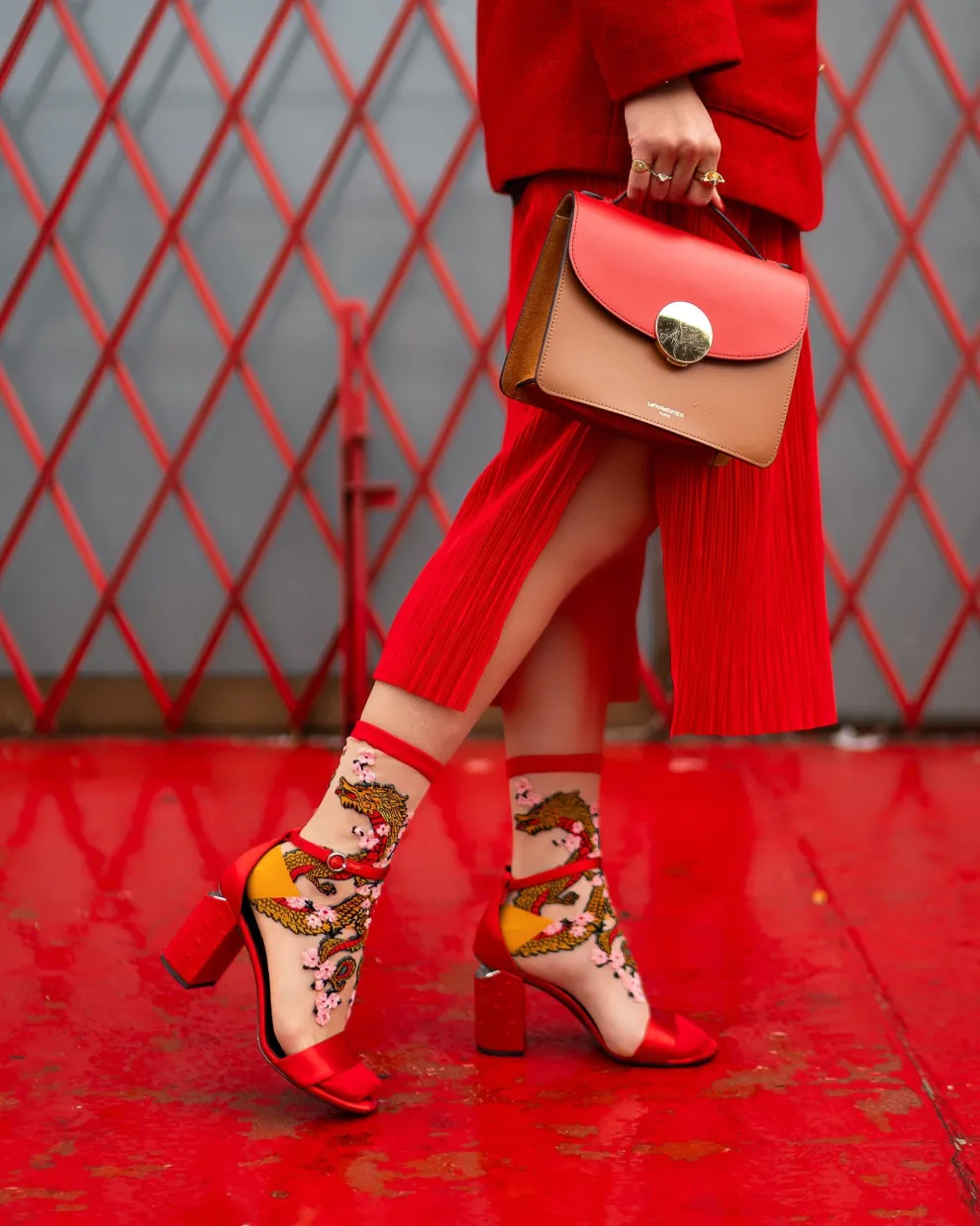 Celebrate Lunar New Year with our stunning Year of the Dragon sock, paying homage to our Founder’s heritage. Two gold and red dragons mirror each other and intertwine, creating perfect symmetry from the front view and a full dragon from the side view. Cherry blossoms give this sheer dragon sock a feminine and unexpected touch. Pair with red shoes and wear all February, from Chinese New Year to Valentine’s Day.