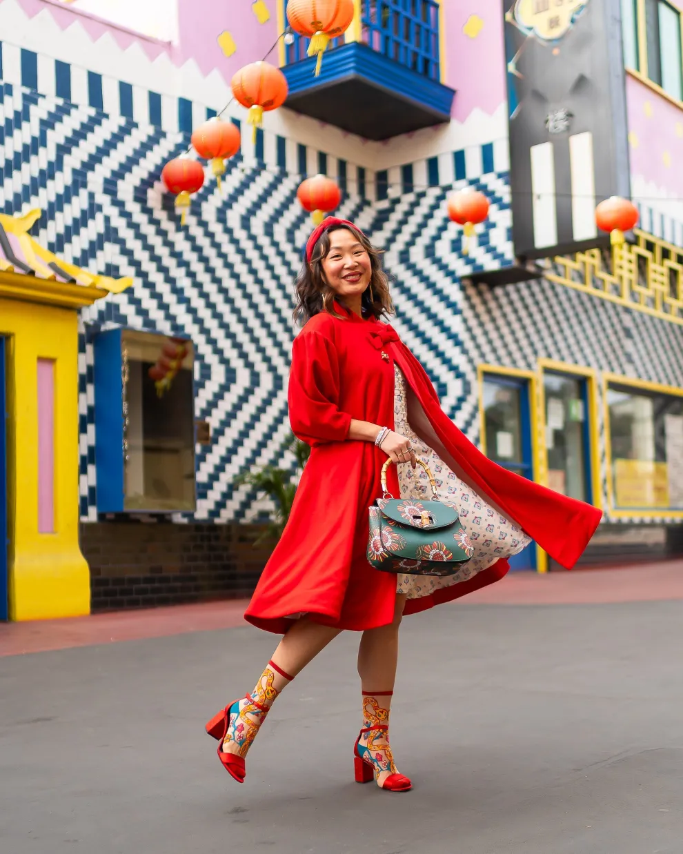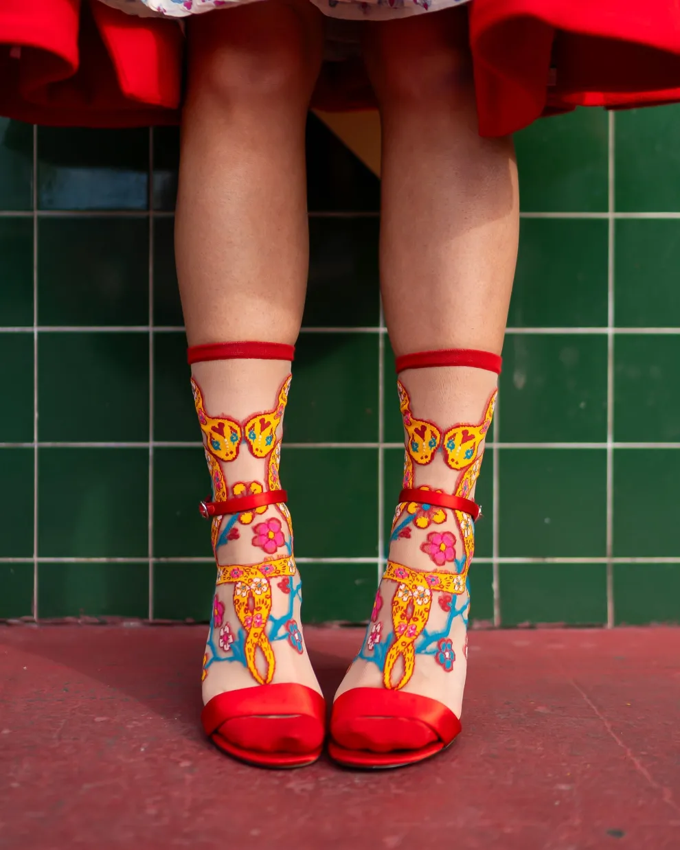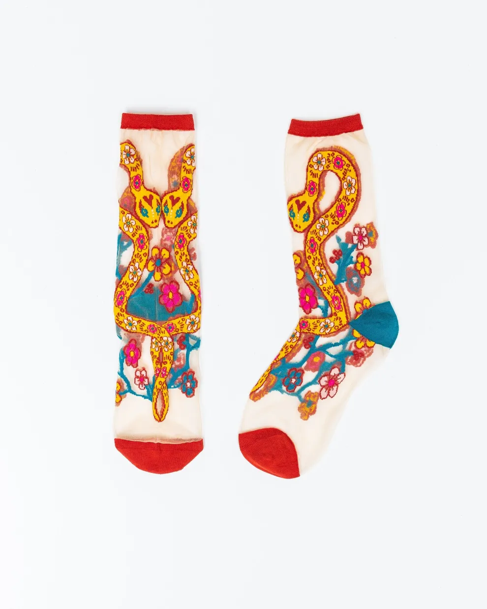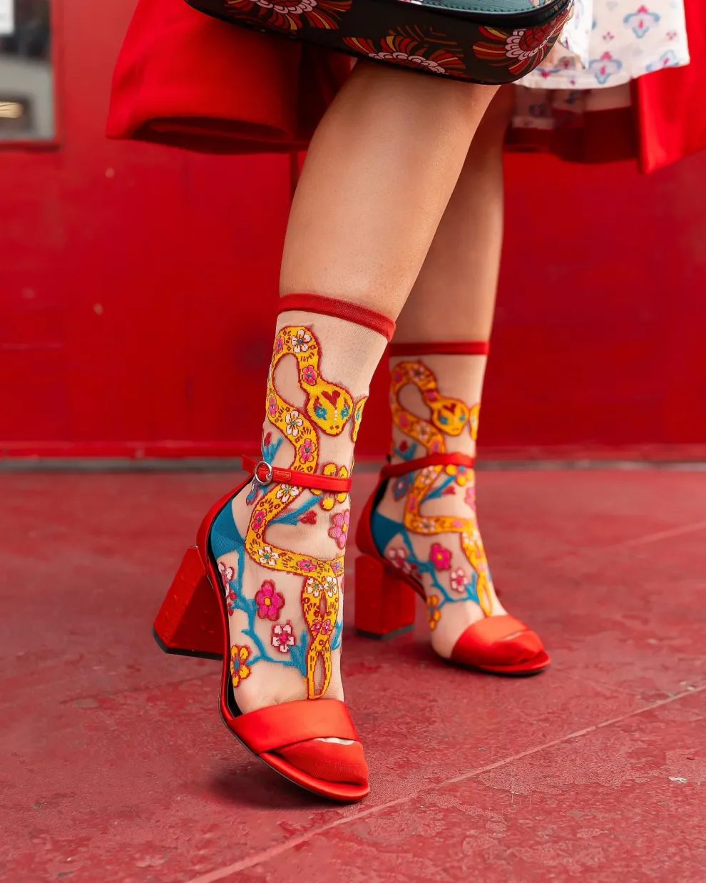 Celebrate Lunar New Year 2025 with our festive Year of the Snake sheer sock. Featuring two yellow snakes with floral patterns in red and turquoise, intertwined to form an abstract heart shape and surrounded by turquoise branches and larger flowers. This sock looks just as stunning from the side as it does from the front, making it an unforgettable showstopper. Pair with red heels for the perfect Lunar New Year look.